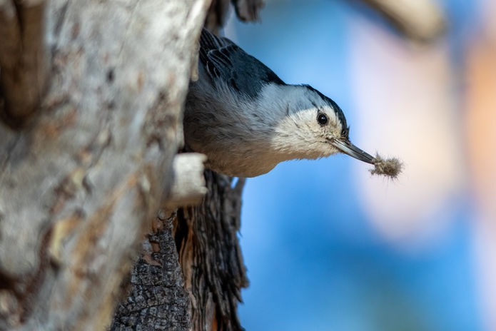 Then, we noticed in the tree to our right a white-breasted nuthatch collecting nesting material. Unlike the Steller’s jays, this little fella was popping out into the morning sun, affording me a decent photo. We paused five minutes or so as I shot photos. Then, in the branches above us, we noticed several yellow-rumped warblers. Like the nuthatch, we have these birds in the Lowcountry, but we only see them in winter plumage, not in the striking shades of breeding season, when they’re dressed to impress. Yellow-rumps come in different varieties — adult male myrtles have white throats and a white eye stripe; adult made Audubon’s have a more uniform gray on their head and a yellow throat. Both varieties look like a different bird than what we see back home.